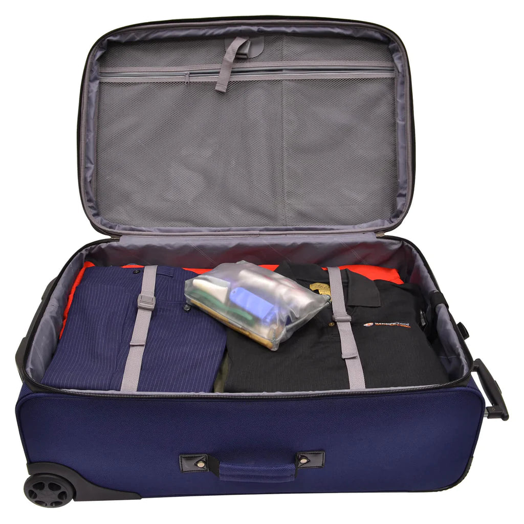 - Expandable feature offers 30% more packing capacity. Interior zippered meshed pocket and tie down straps.